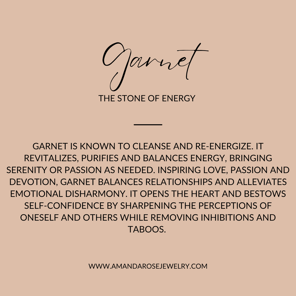 Garnet is known to cleanse and re-energize. It revitalizes, purifies and balances energy, bringing serenity or passion as needed. inspiring love, passion and devotion, garnet balances relationships and alleviates emotional disharmony. It opens the heart and bestows self-confidence by sharpening the perceptions of oneself and others while removing inhibitions and taboos.