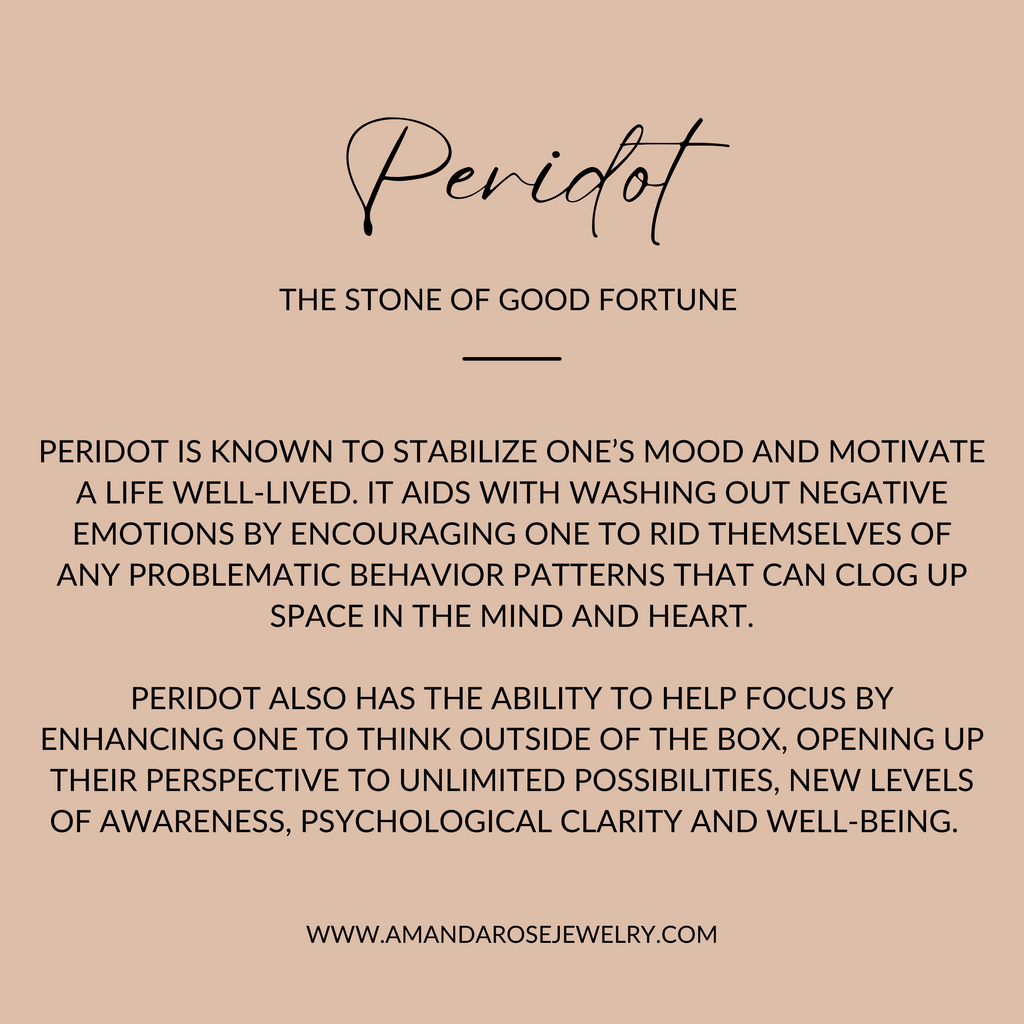 Peridot is the stone of good fortune. It's known to stabilize one’s mood and motivate a life well-lived. It aids with washing out negative emotions by encouraging one to rid themselves of any problematic behavior patterns that can clog up space in the mind and heart. Peridot also has the ability to help focus by enhancing one to think outside of the box, opening up their perspective to unlimited possibilities, new levels of awareness, psychological clarity and well-being.