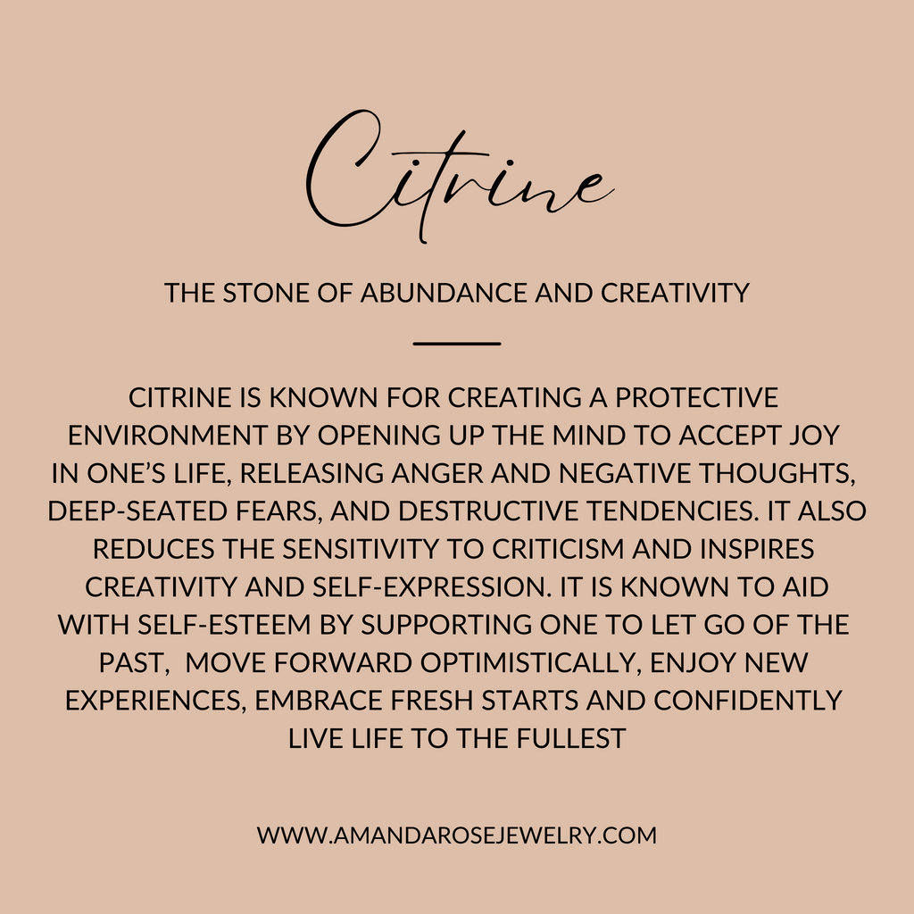 Citrine is the stone of abundance and creative. It is known for creating a protective environment by opening up the mind to accept joy in one’s life, releasing anger and negative thoughts, deep-seated fears, and destructive tendencies. It also reduces the sensitivity to criticism and inspires creativity and self-expression. It raises self-esteem, and by letting go of the past, allowing one to move forward optimistically, confidently living life to the fullest, enjoying new experiences and embracing fresh starts.